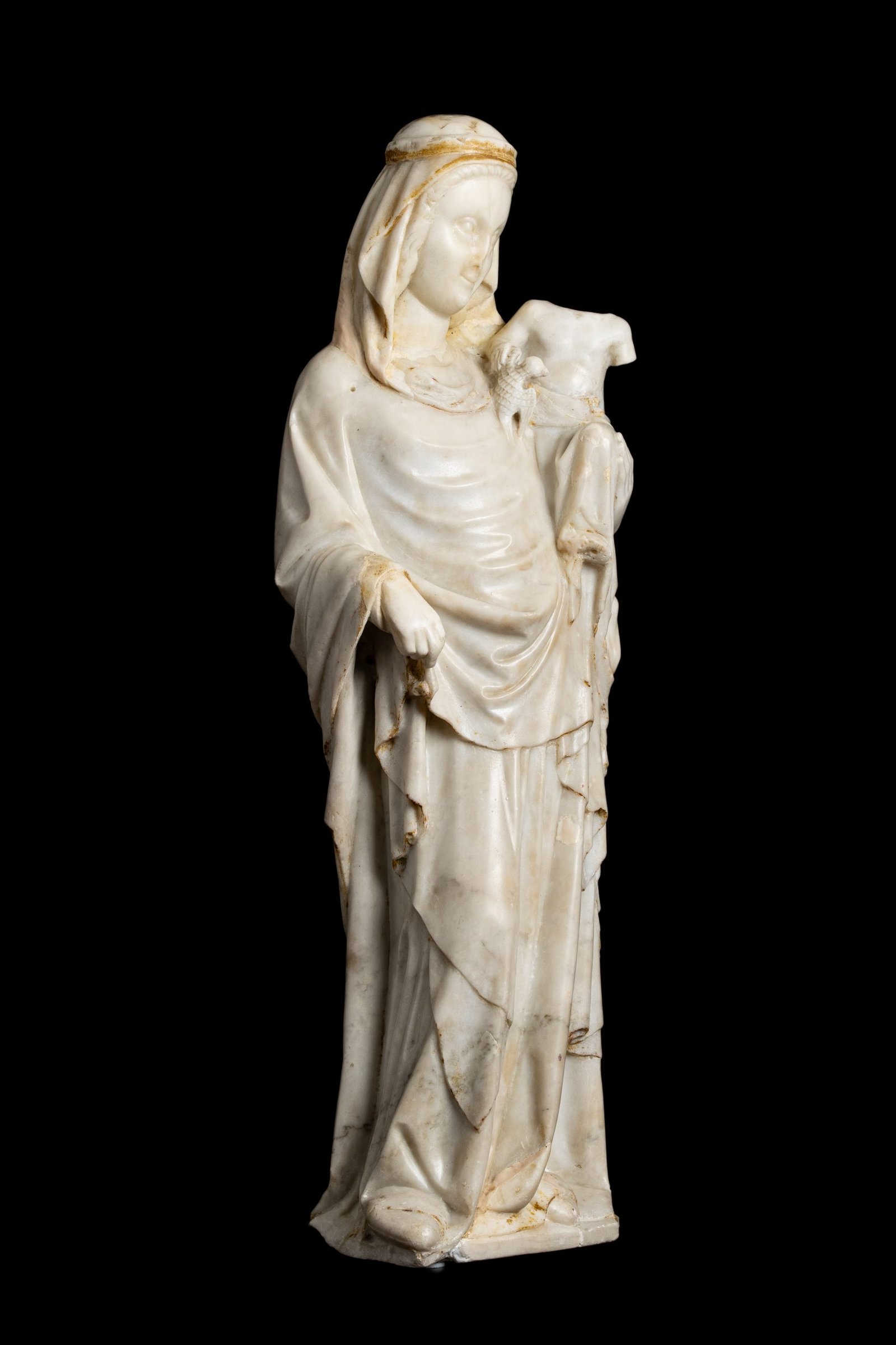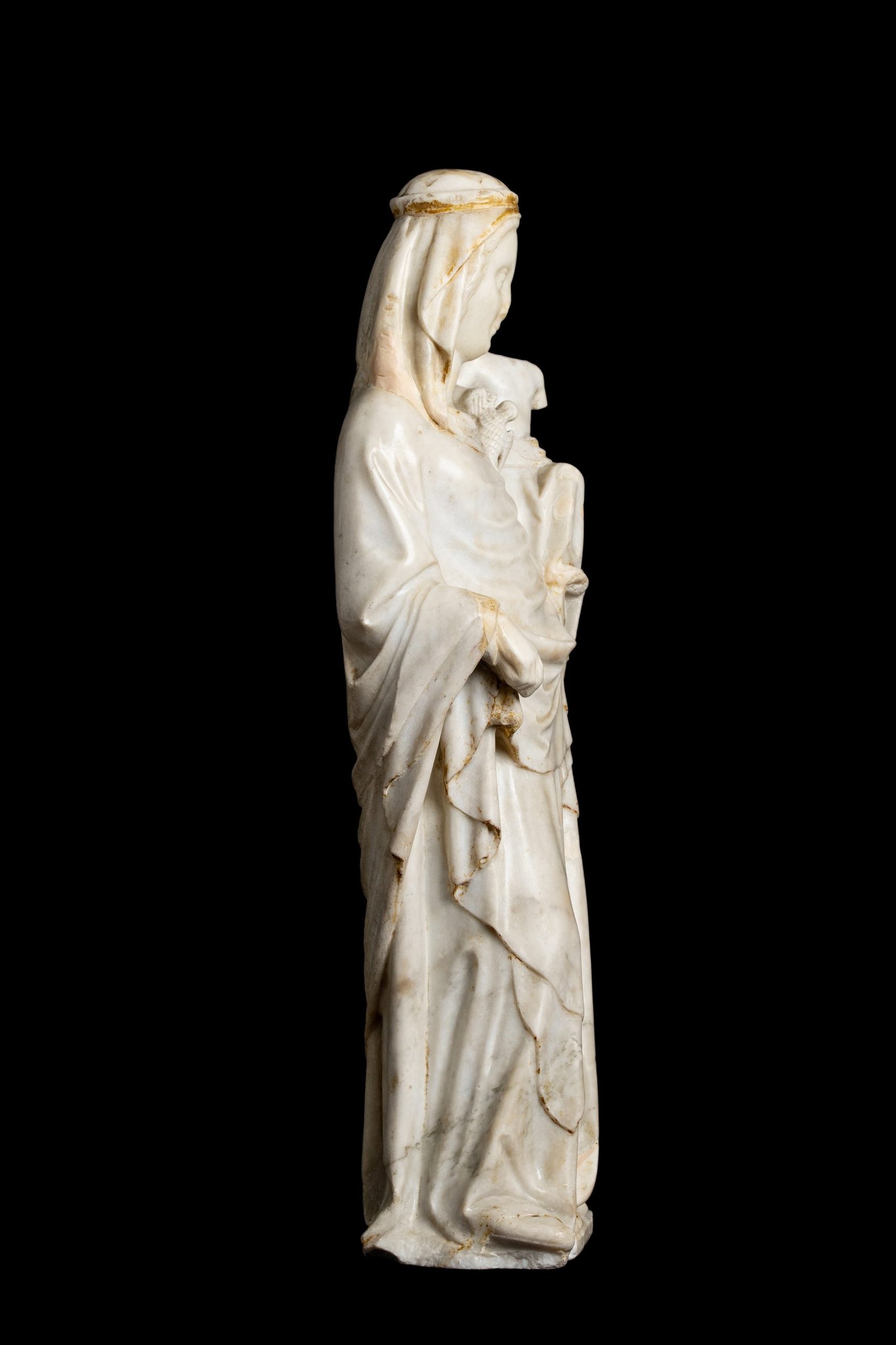 A 15th century gilded marble statue of the Madonna and the baby Jesus in her lap.