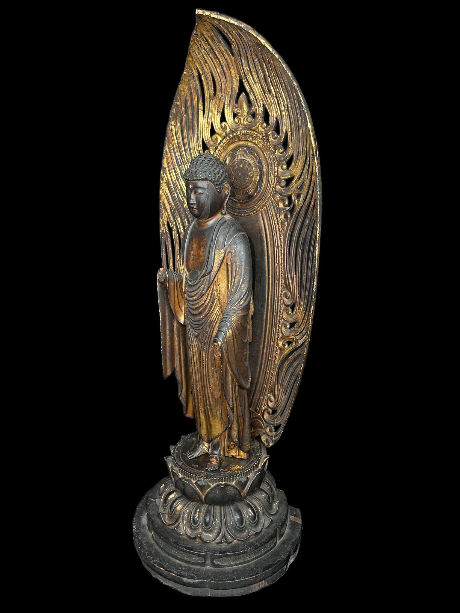 Gilded wood carving of Amida Nyorai from the Kamakura period of Japan. Amida, or Amitayus, is the chief Buddha of Mahayana Buddhism and is also considered the heavenly Buddha of Pure Land Buddhism. Amida stands barefoot on a double lotus throne, his body encircled by a monastic robe, the material of which is arranged in lifelike folds and gilding appears in places alongside the black lacquer finish. Hands are under restoration.