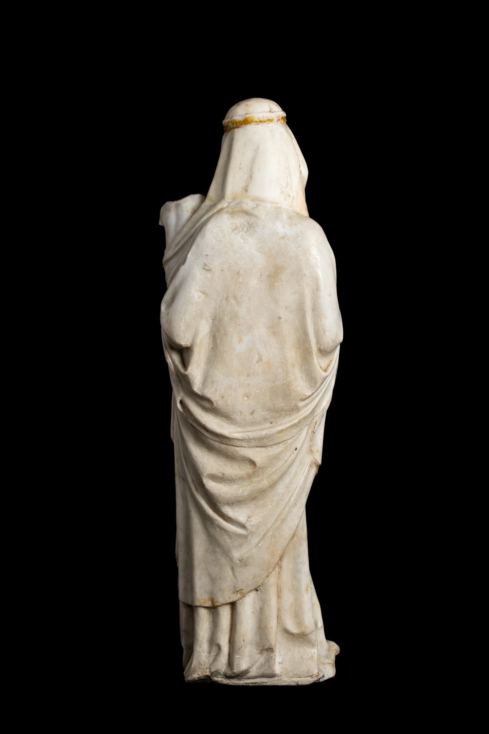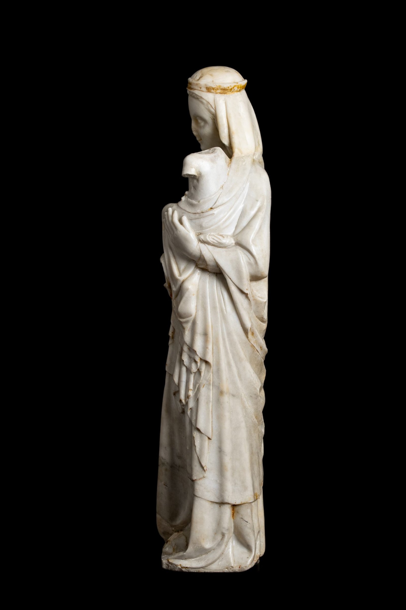 A 15th century gilded marble statue of the Madonna and the baby Jesus in her lap.