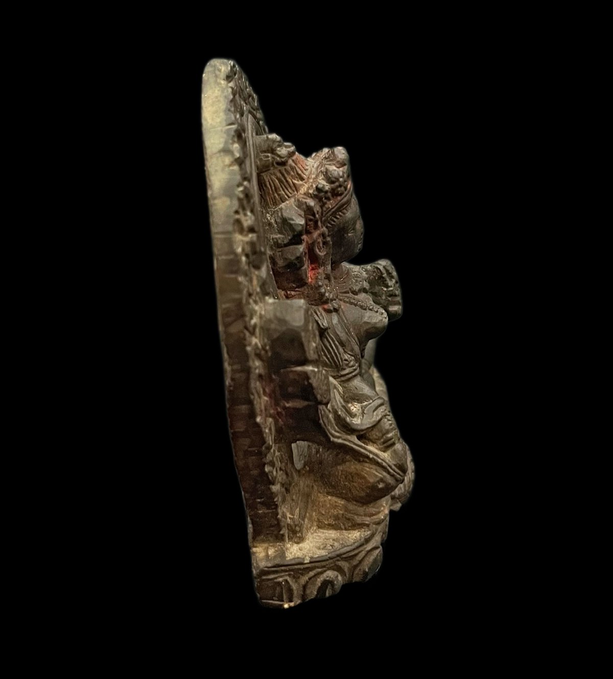 Tara is seated on a lotus pedestal with her body in the lalitasana (“royal seat”) position. Her right foot rests on a lotus flower, a dynamic movement symbolizing her readiness to come to the aid of others. Her right hand forms a varada mudra (‘gesture of generosity’) and her left hand a vitarka mudra (‘circle of infinite teaching and learning’). Her body is slender and very feminine, wearing numerous necklaces and bangles; on her head she wears an ornate crown and heavy earrings, all symbolizing her spiritual purity and exalted position. Behind her, there are lotus blossoms and a leaf-shaped mandorla.